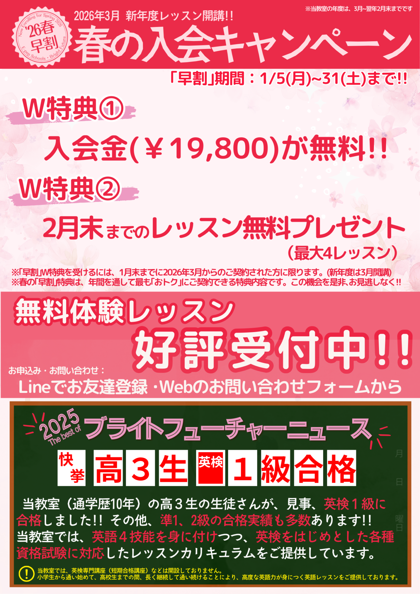 3月の新年度開講に合わせ、ブライトフューチャーでは、2026年度春の入会キャンペーンを行っています。保護者の皆様からのお問い合わせ、体験授業のお申込みをお待ちしております。