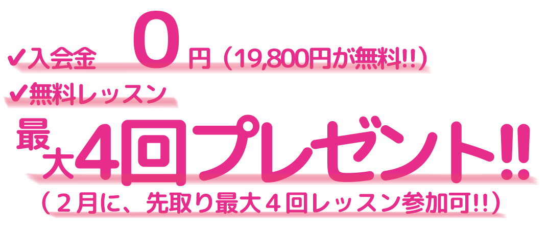 入会金が無料(全額OFF)に加え、2月から先行してレッスンに参加できる、無料レッスン(最大4回分)をプレゼント 。この機会をお見逃しなく!!